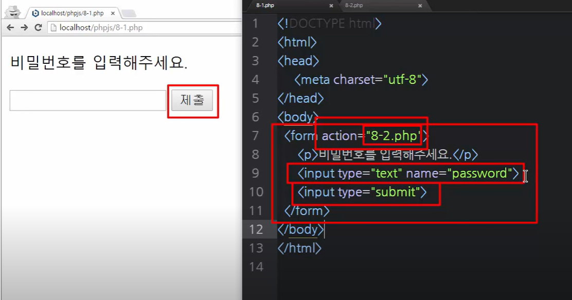 form 태그안에서 submit이라는 제출을 누르면 text password라는 값을 action= 에 전송한다.