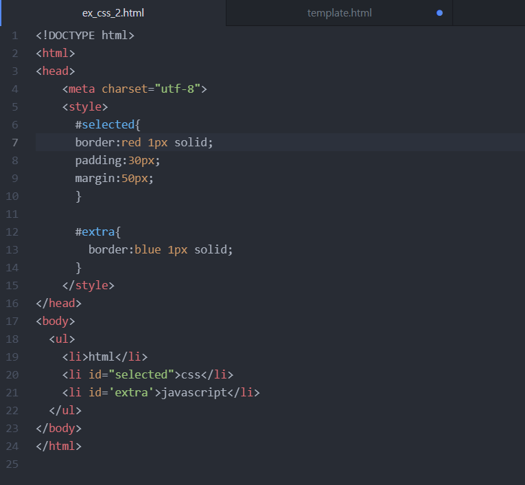 - li css값에 id=selected라는 id값을 만들어서<style>안에 #selected {동일} 작성