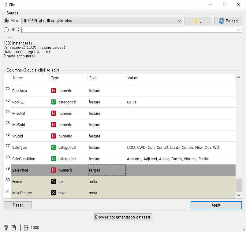 주관식 예측 Yes, No 가 아닌 숫자 자체를 예측해 보는 것이다. 여기서 말하는 집값 예측이란 집값이 앞으로 오를 건지 내릴 건지를 예측하는 것이 아니고 조건이 이럴 경우(방이 몇 개라든지, 방향이 어느 쪽이라든지, 역에서 얼마만큼 떨어져 있다든지 등) 집값이 대략 얼마 정도 할 것이라고 짐작해 보는 예측을 의미한다. 파일을 불러온 후 '아이오와 집값 예측_공부' 파일을 로드시킨다. 집값을 예측하는 것이므로 제일 마지막에 SalePrice 변수의 Role을 Target으로 변경한다. 수많은 변수들 중 어떤 변수가 Target 즉, 집값에 영향을 끼치는지 보고 싶다면 파일에서 Rank을 연결한다. 결과를 보니 이웃, 2층 외관, BSM 노출 등이 집값에 가장 영향을 끼치는 것으로 나타났다. 회귀 분석 ..